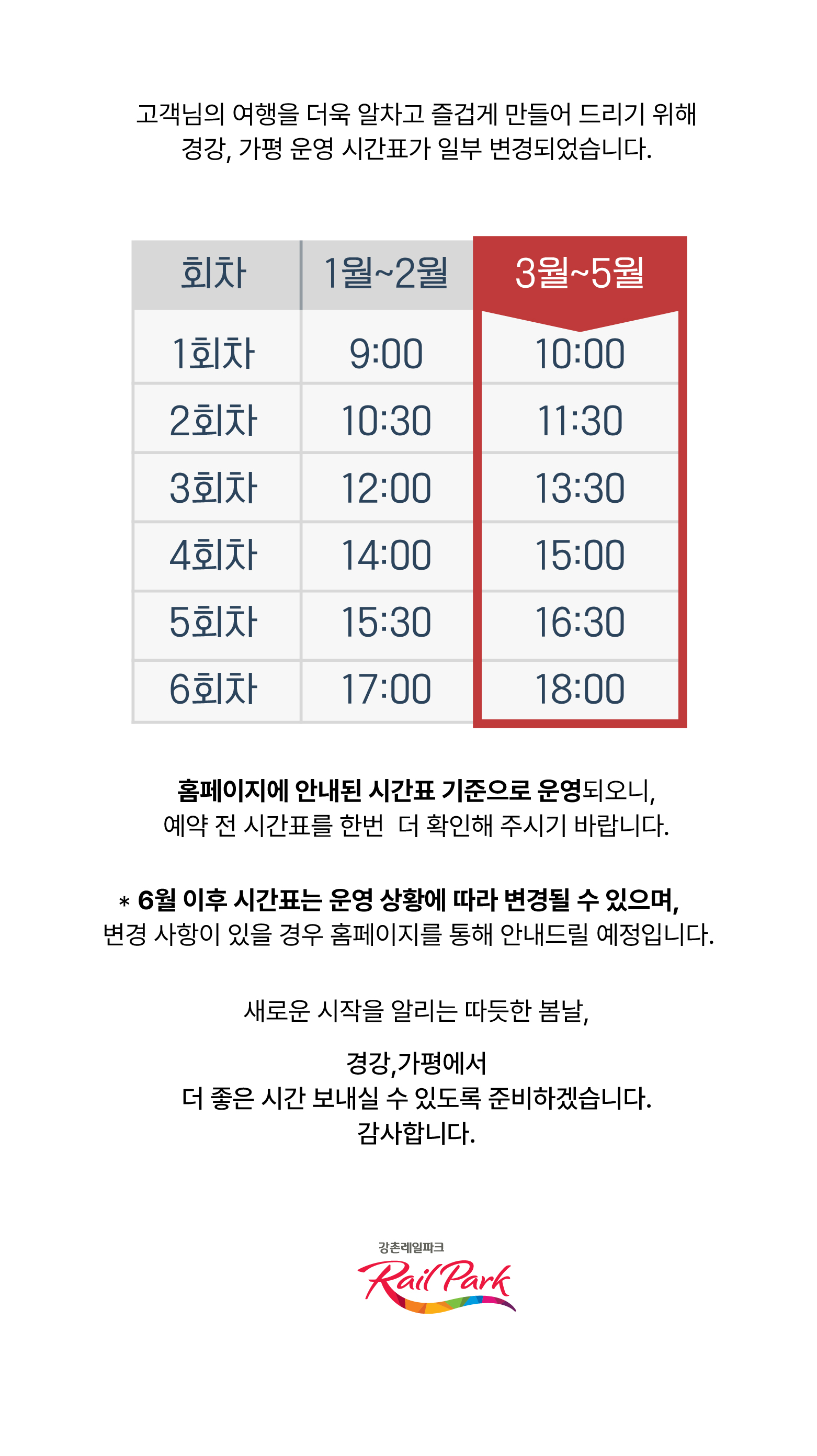 경강·가평 운영 시간표 변경 안내(3월부터 적용)
